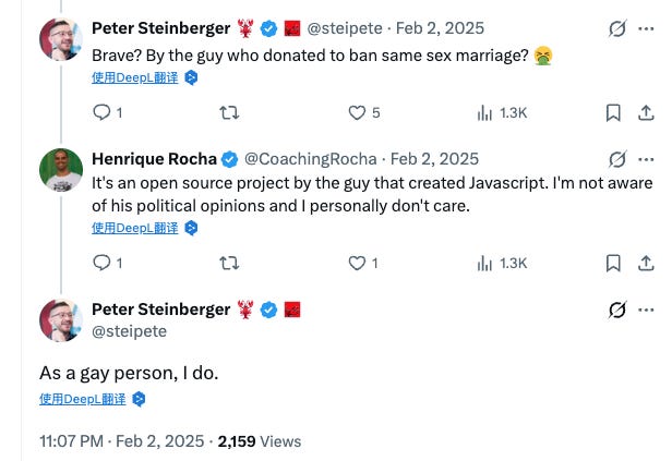 科技圈其实有很多关于他的“小八卦”。有开发者曾半开玩笑说:Peter 很可能是 gay。原因很简单:他几乎从不谈恋爱或家庭,朋友圈也几乎全部是程序员。强哥查到今年2月,Peter在一个X的回贴中,说了自己是gay。